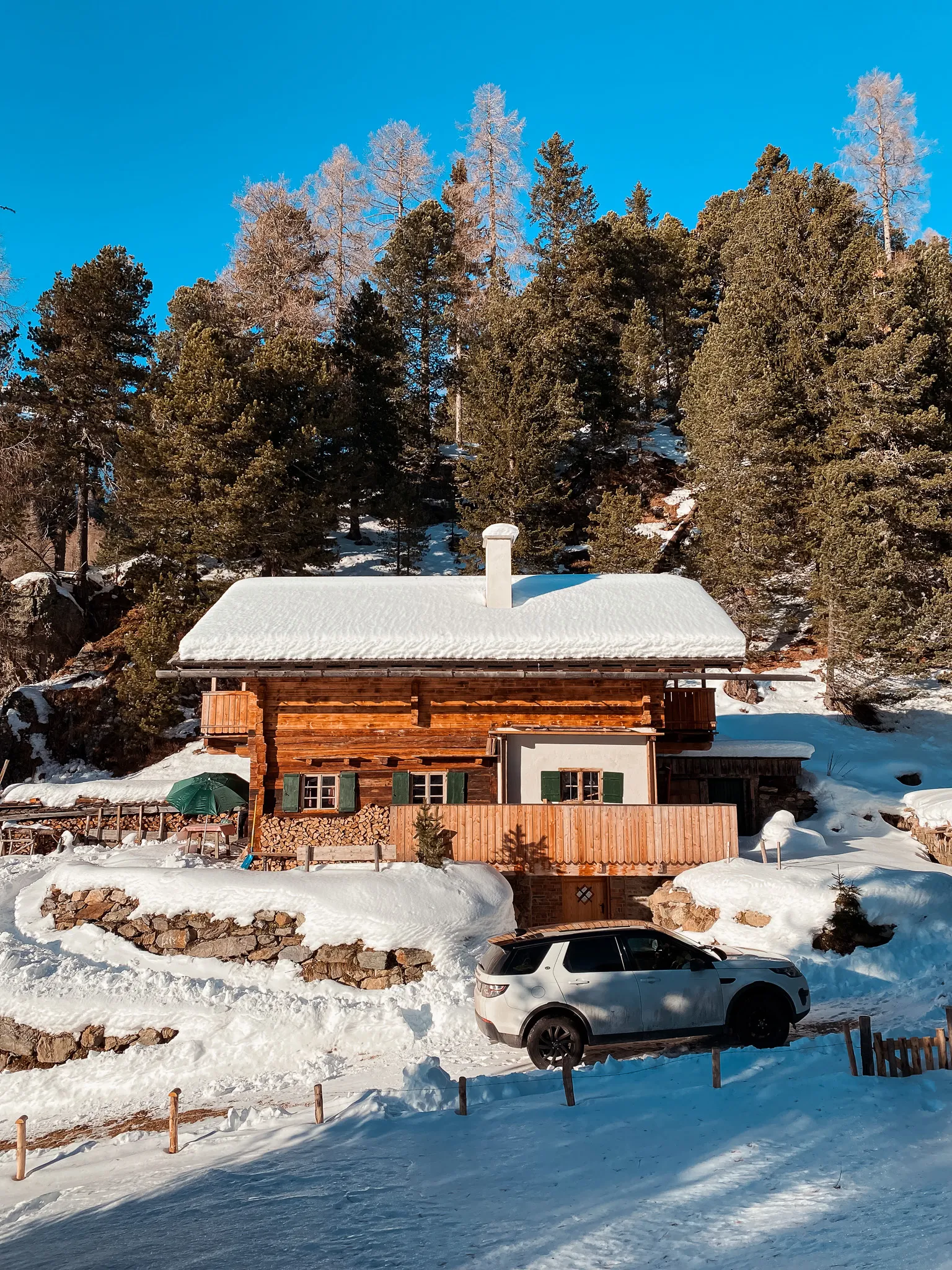 Die Hütte bietet Platz für bis zu sechs Personen in zwei Schlafzimmern. Die Ausstattung ist bewusst schlicht gehalten: eine gemütliche Stube, eine Küche mit Holzherd und Gaskocher, sowie eine Badestube mit Holzofen für Warmwasser. Auf dem umliegenden Grundstück finden Sie Sitzgelegenheiten für sonnige Stunden und zwei Balkone mit Blick auf die umliegende Bergwelt.